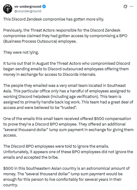 While not much is yet known about the nature of the attack, early reports suggest it may have involved an outsourced employee who accepted a bribe in exchange for photographing Discord user data: